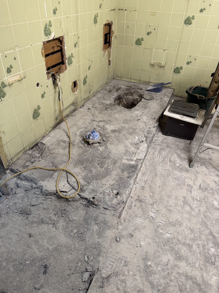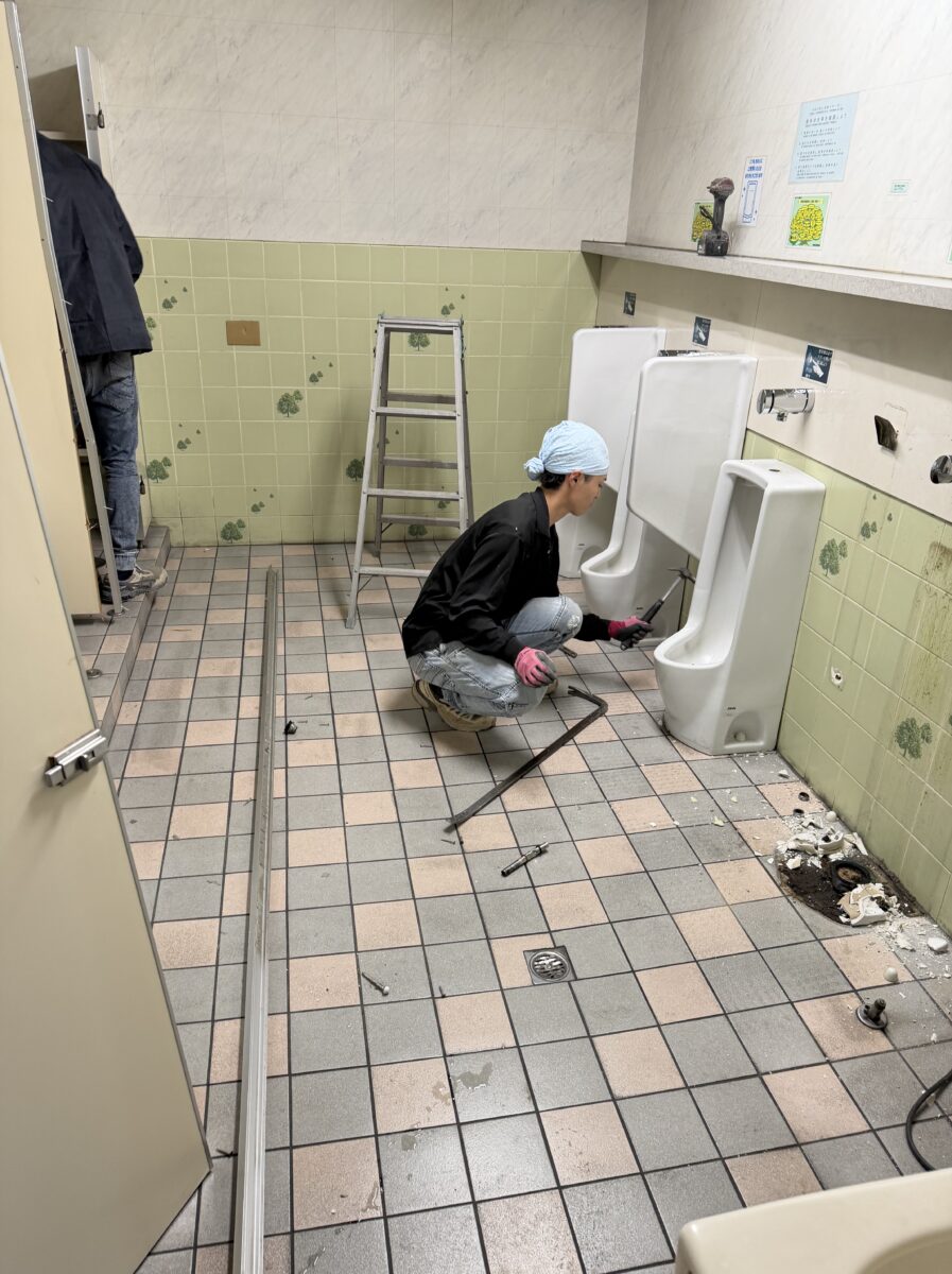 スケルトン解体: 床や壁のタイルをすべて剥がし、配管から見直します。
