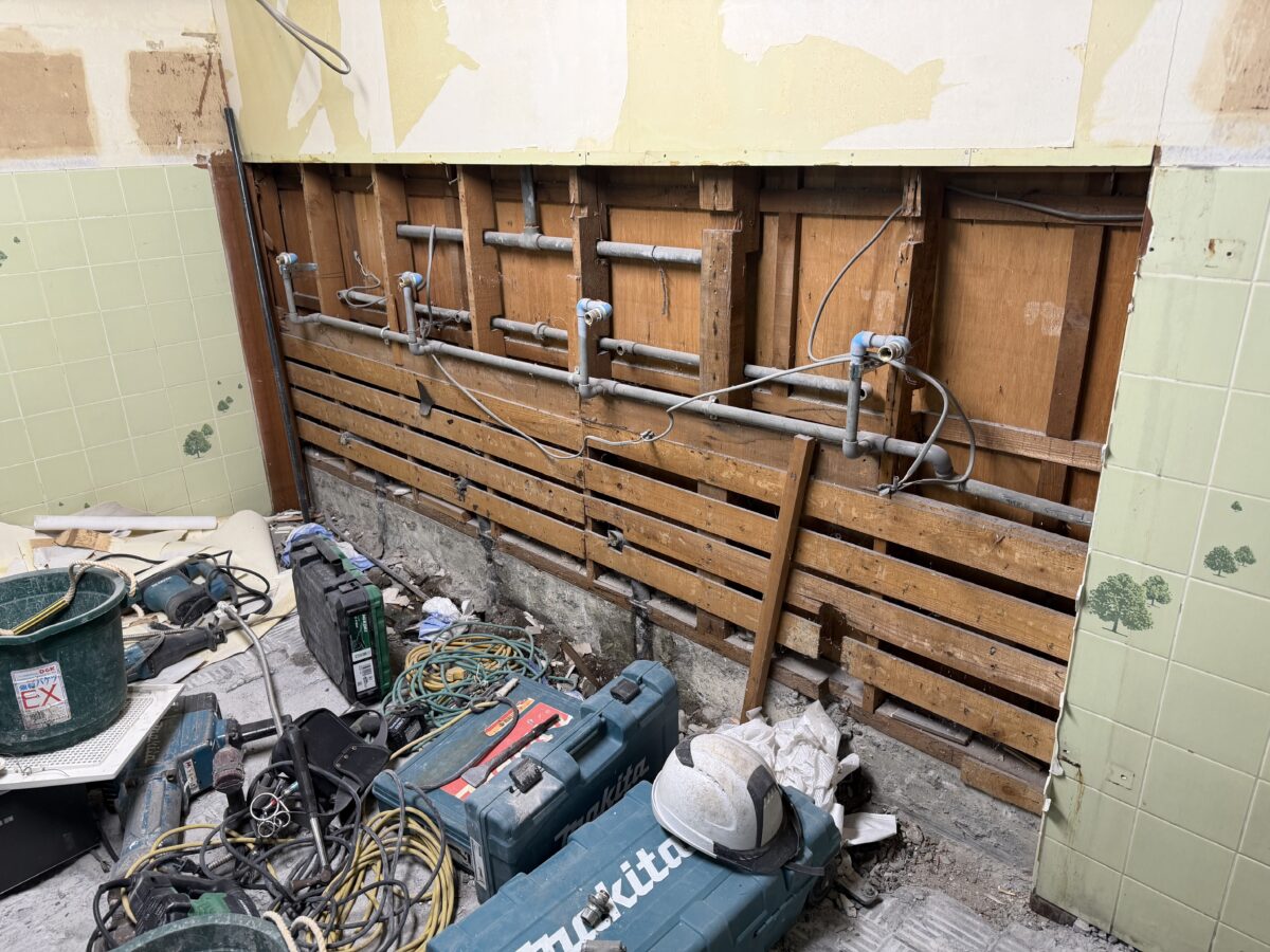 配管の刷新: 老朽化した配管を新しいものへ交換。壁内部の木材の状態まで念入りにチェックし、土台から作り直します。