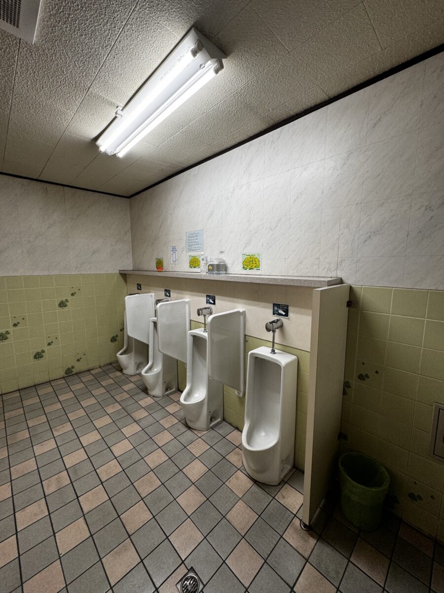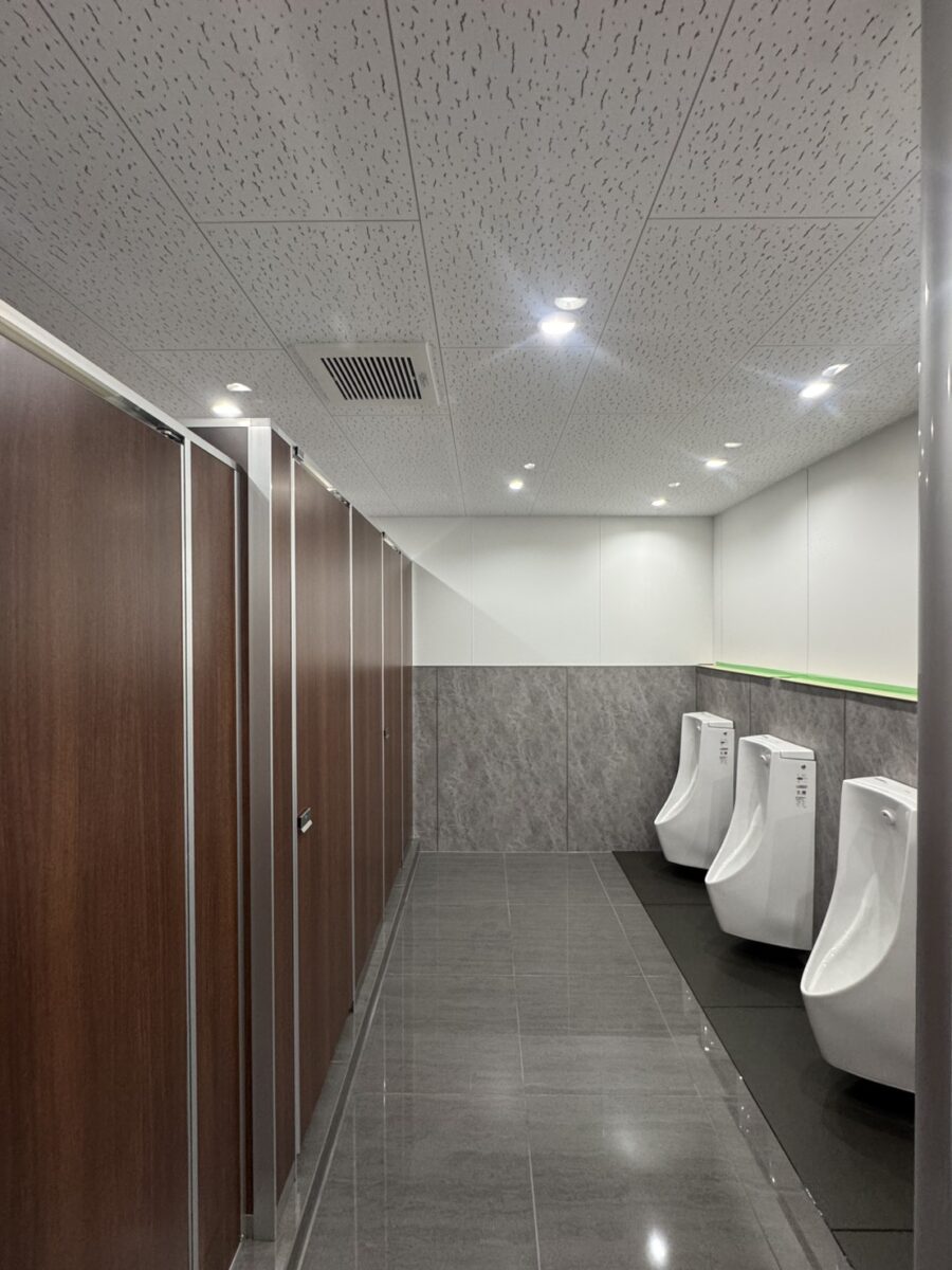 浮遊感のある設備: 小便器は壁掛け式を採用。床との接地面がないため、床掃除のしやすさが劇的に向上しています。
