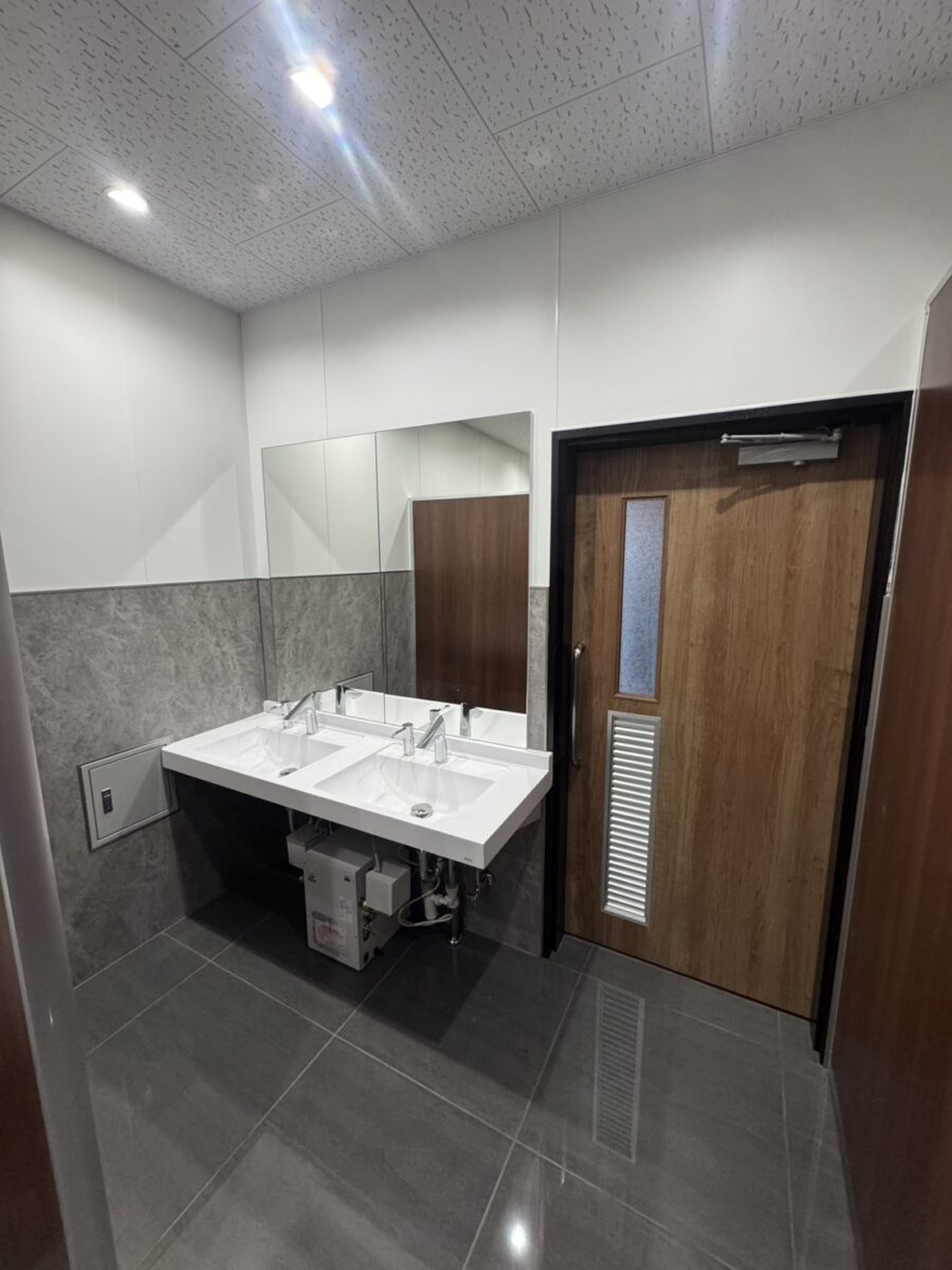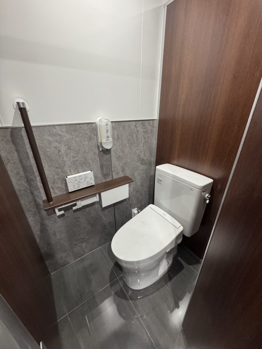 上質なプライベート空間: 個室には落ち着いた木目調のパーテーションを採用。最新の温水洗浄便座、リモコン、手すりを完備し、従業員の皆様がリラックスできる空間に仕上げました。