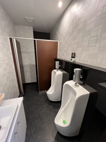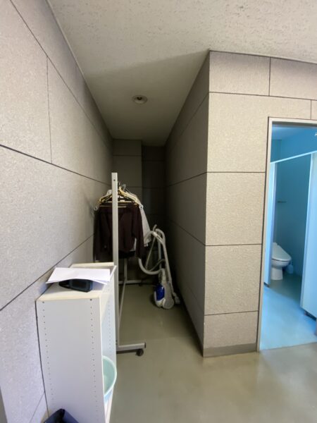 男子トイレの脇にスペースが余っており、ハンガーなどが設置されていました。このスペースにトイレを拡張することで、女子トイレのスペースを作ります。
