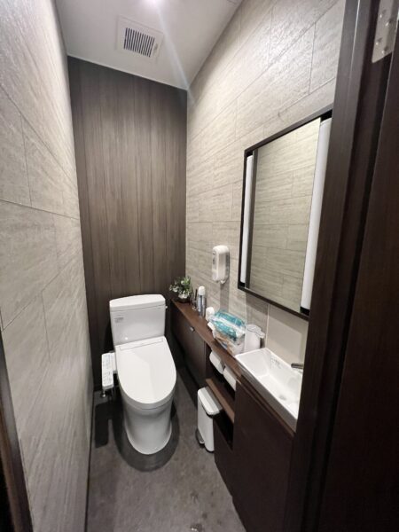 手前が女子トイレ、奥が男子トイレとなっています。既存の佇まいを壊さないような雰囲気にできたように思います。